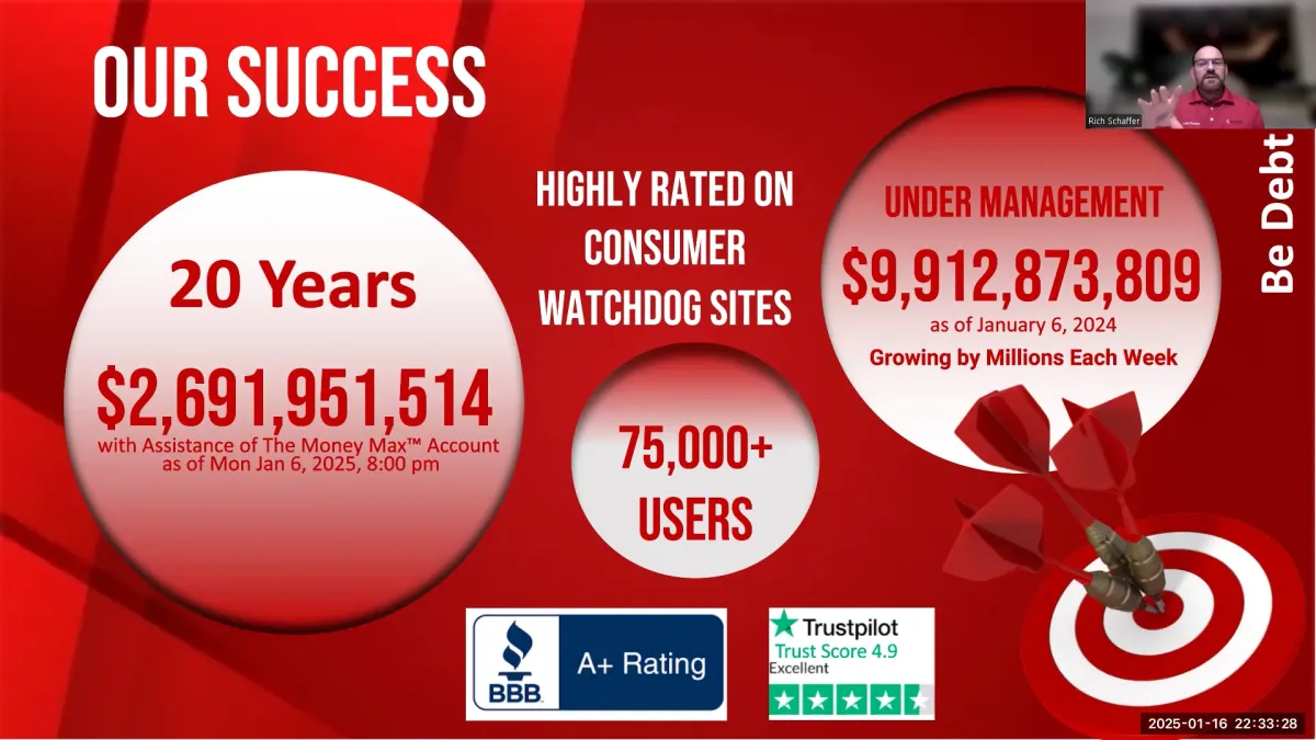United Financial Freedom (UFF) has been helping Home Owners pay off their mortgages and other debts since 2004, with over $2 .6 Billion in debt eliminated with the use of Money Max Account, over $9.9 Billion of Debt Under Management and growing by Millions each week. They have an A+ rating with the Better Business Bureau, a 4.9 Excellent rating with Trust Pilot, with over 75,000 users, and still growing.